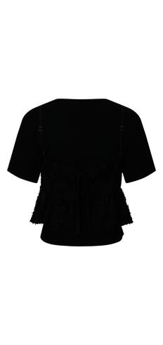 작년부터 사고팠으나 품절이었는데 다시 나와서 보니 리뷰가 많고 좋아 믿고 주문했습니다. 역시 재질도 좋고 넘 예쁘네요. 티셔츠는 부드러우면서 탄력있게 쫙쫙 늘어나서 아주 편합니다. 뷔스티에 레이스도 예쁘고 뒤에 긴끈으로 리본 두개 묶게 되어있는데 리본때문에 뒷태도 넘 예쁩니다. 옆태는 또 귀엽고 너무 만족스럽습니다!!! 길이가 수치상으로는 짧은데 실제로는 적당한 크롭사이즈입니다.