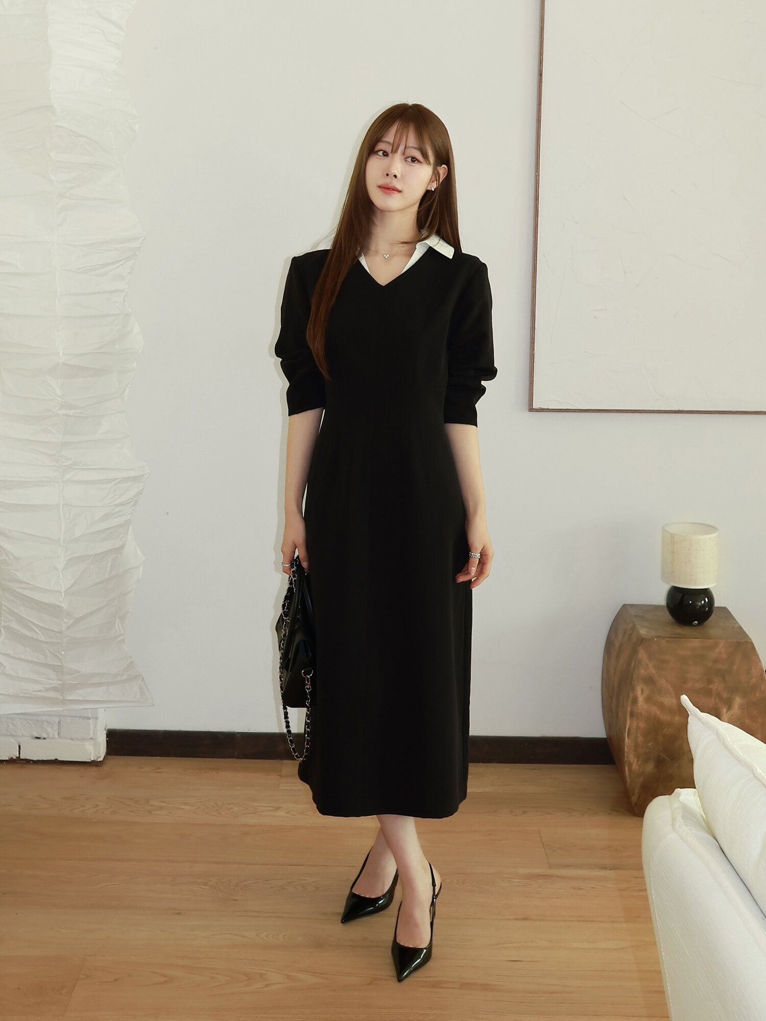 볼륨 슬리브 배색 칼라 원피스