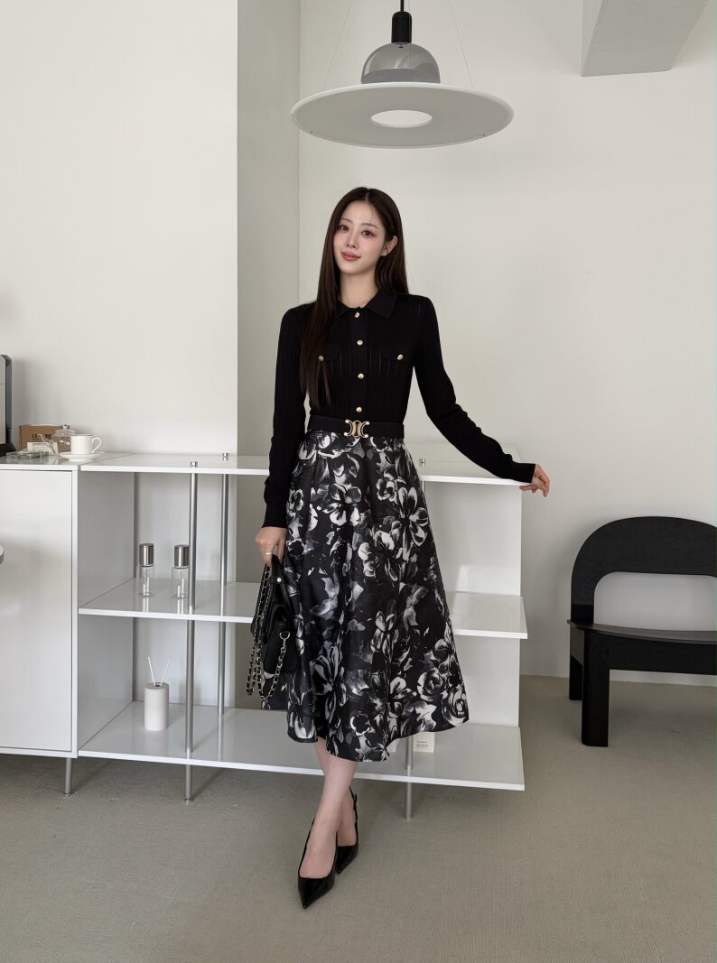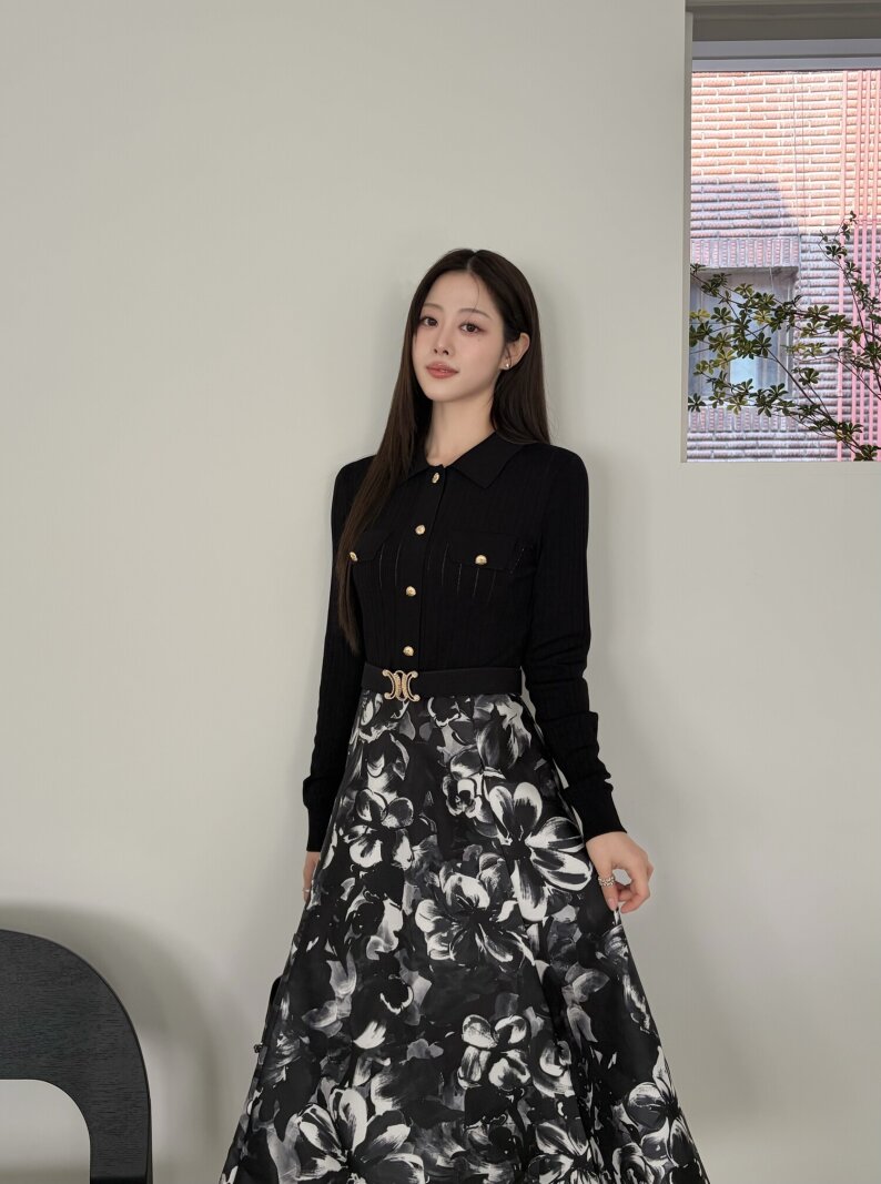플로럴 배색 플레어 니트 원피스