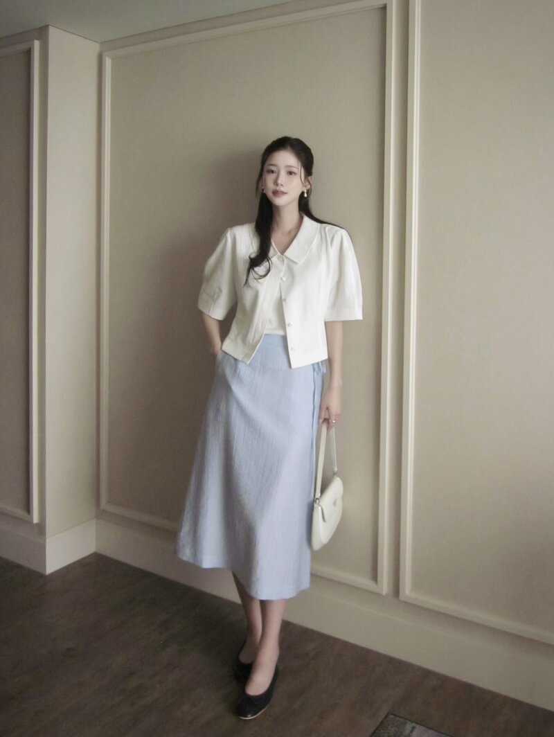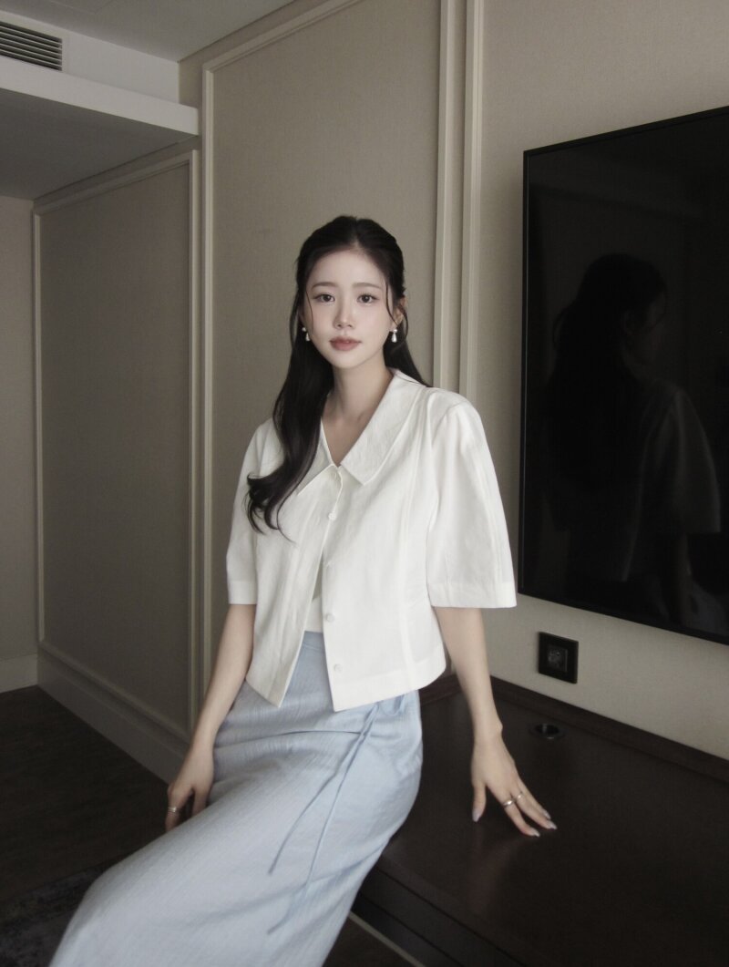 코튼 볼륨 슬리브 칼라 블라우스