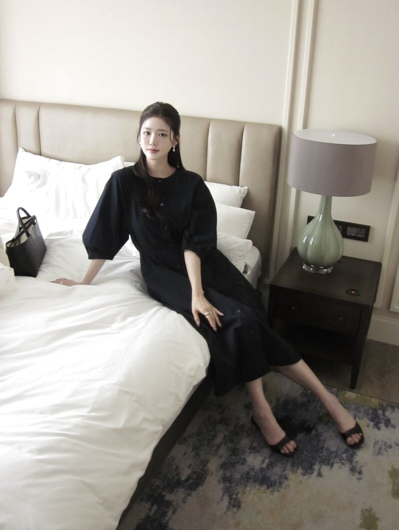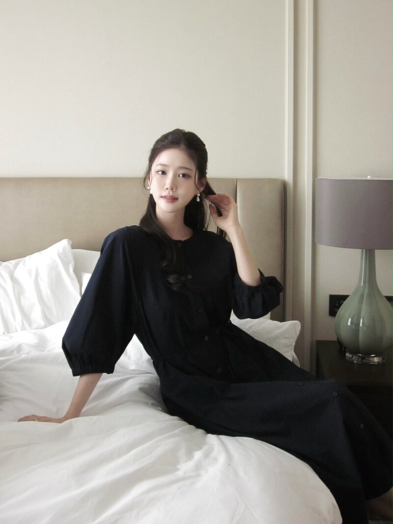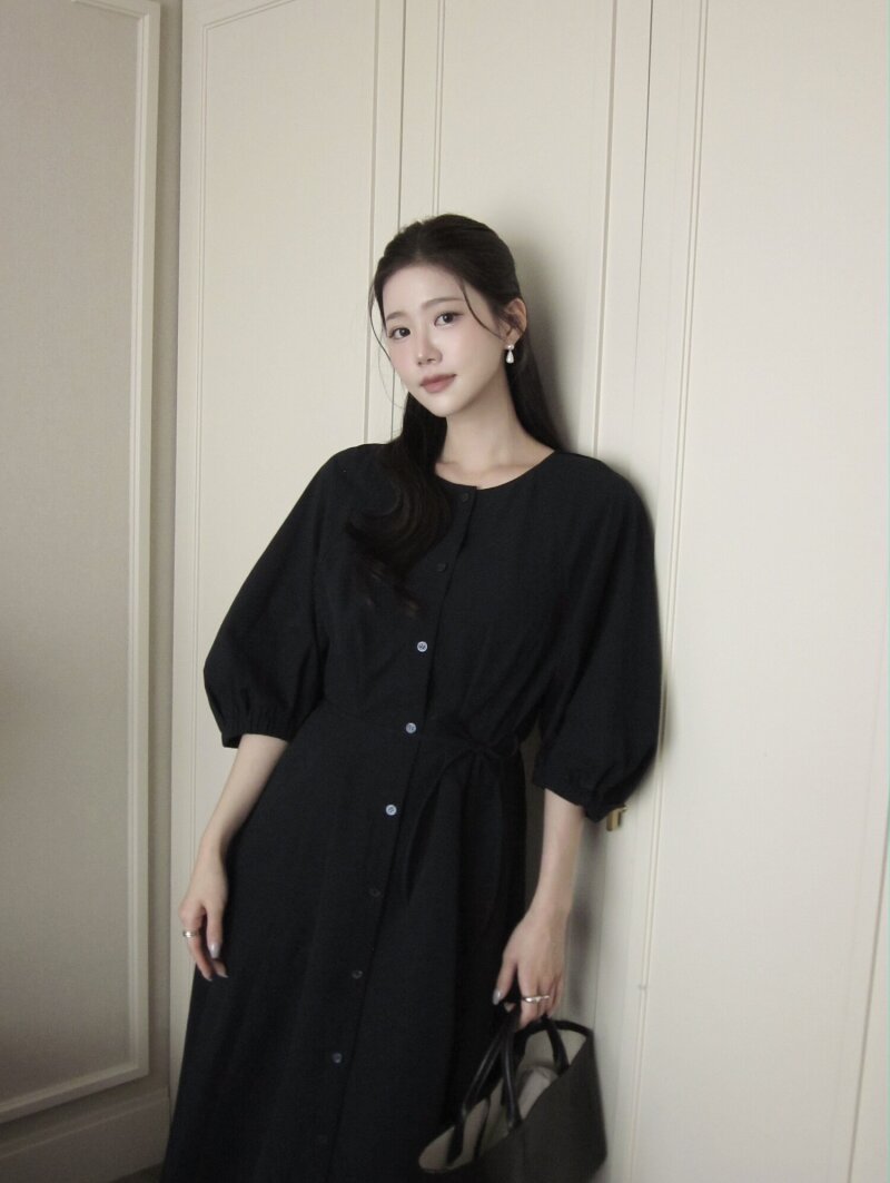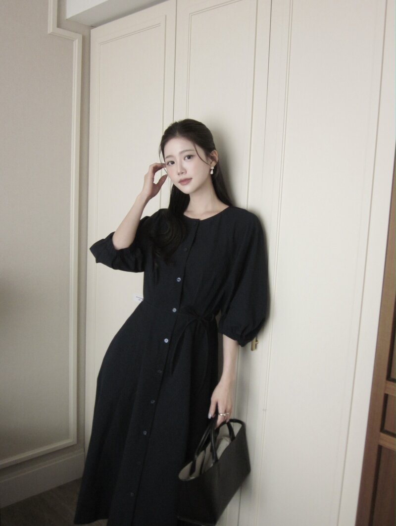 벨티드 라운드넥 플레어 원피스